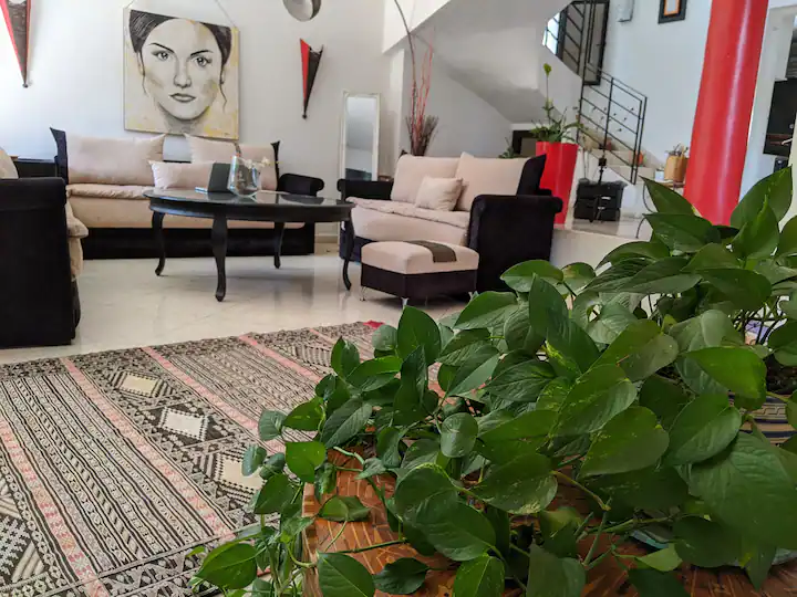 The villa is in an extremely secure compound and is in front of a supermarket, butcher shop, and other local amenities. The bus stop to Rabat’s Old Medina is located 1 minute from the villa. The villa is also just a 5 minute drive to Hay Riad.