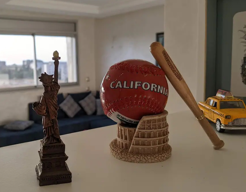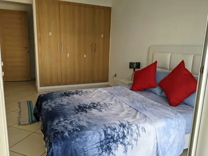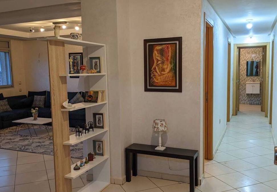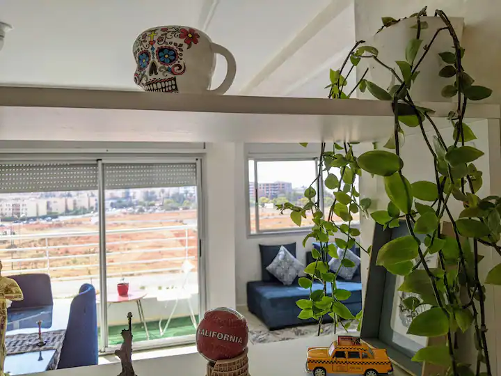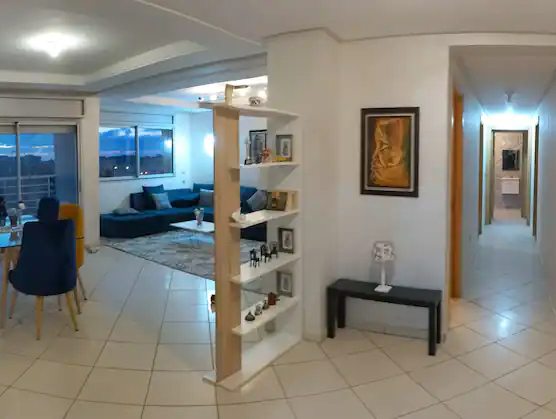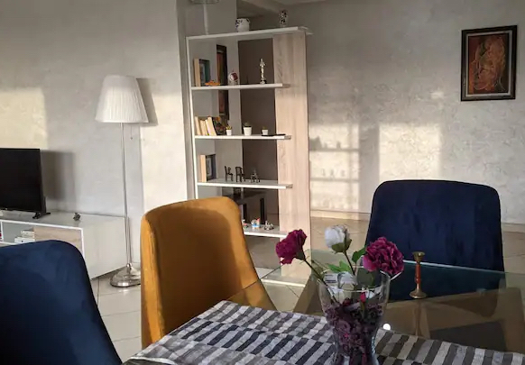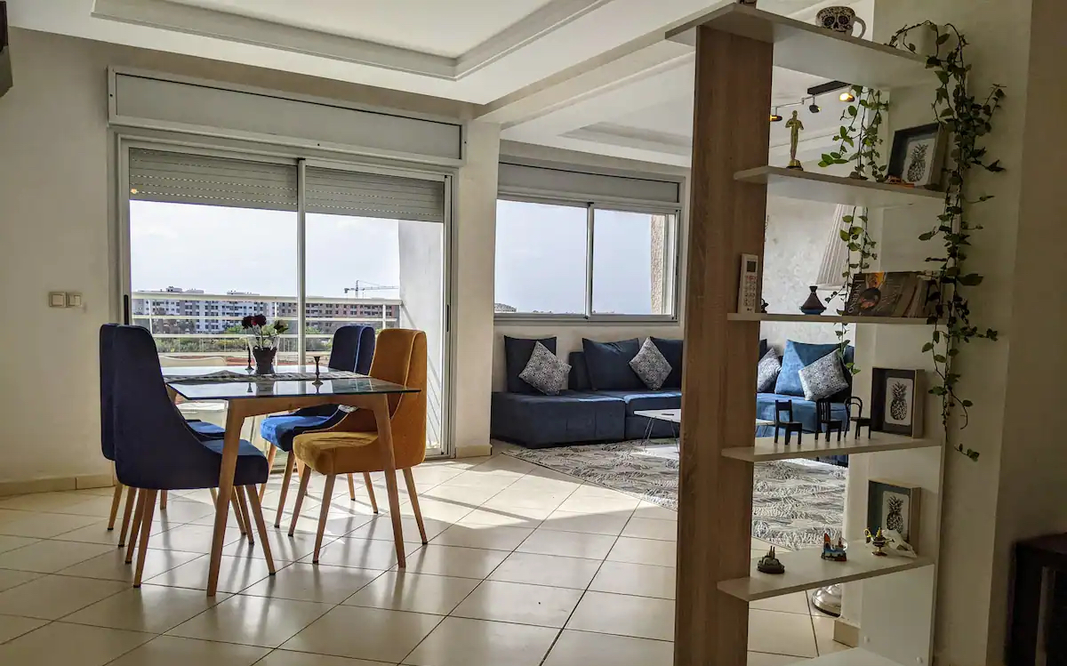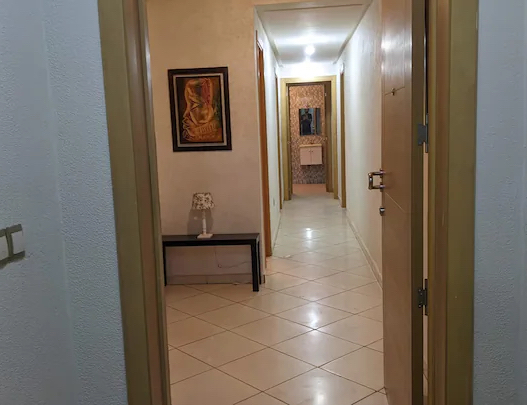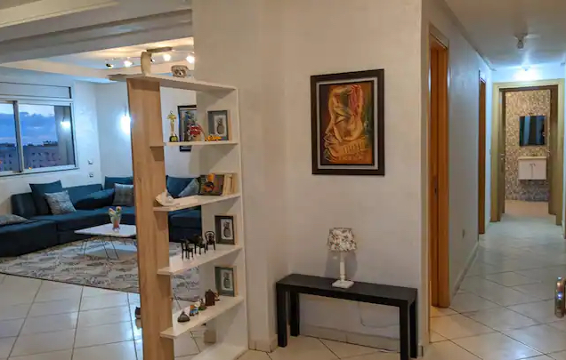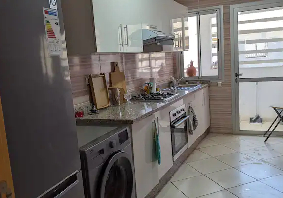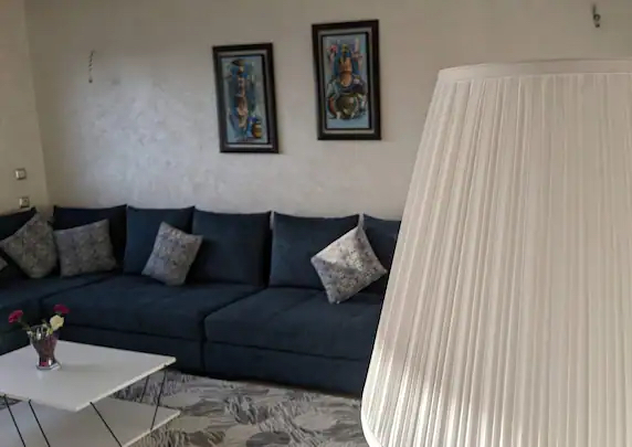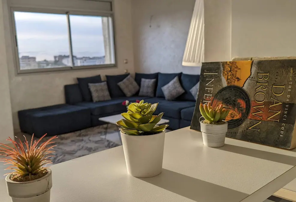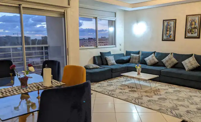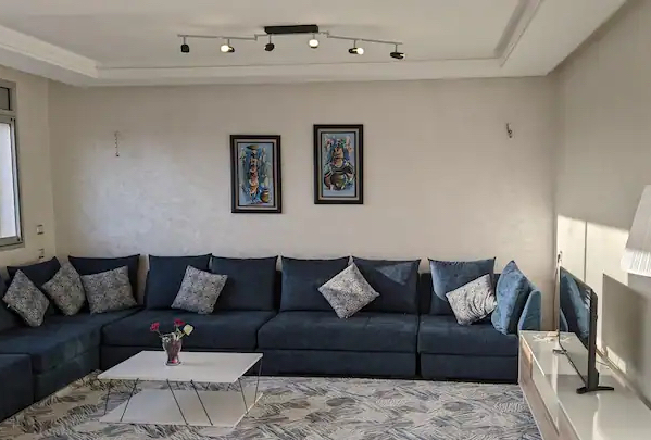 The apartment is located in the center of Sala al Jadida, close to all amenities: supermarkets, restaurants, grocers, swimming pools, and sports halls.