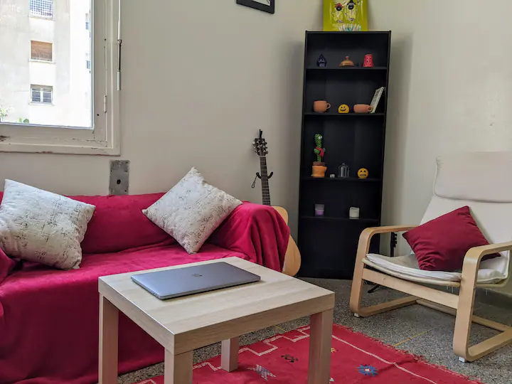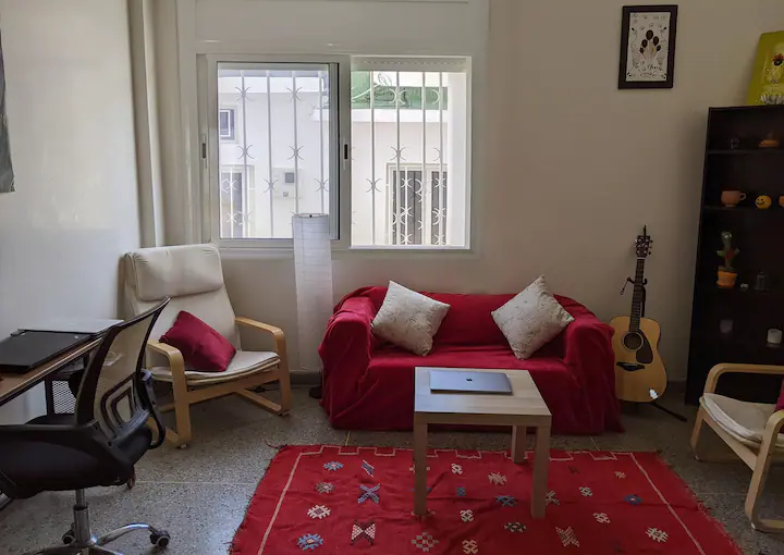 The apartment is situated between Rabat’s L’Ocean and Dior Jamma neighborhoods. The space is located on Rue Congo, a quiet street just steps away from all necessities – supermarkets, restaurants, grocery stores and gyms.