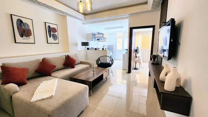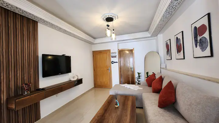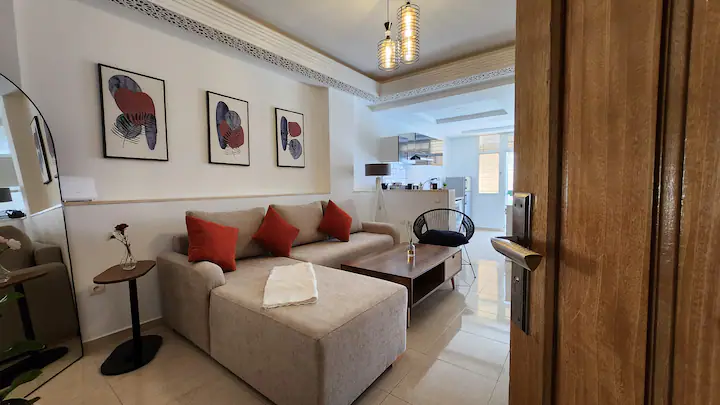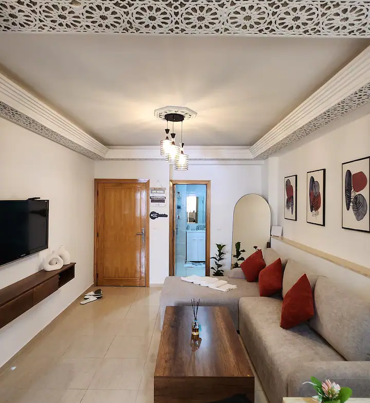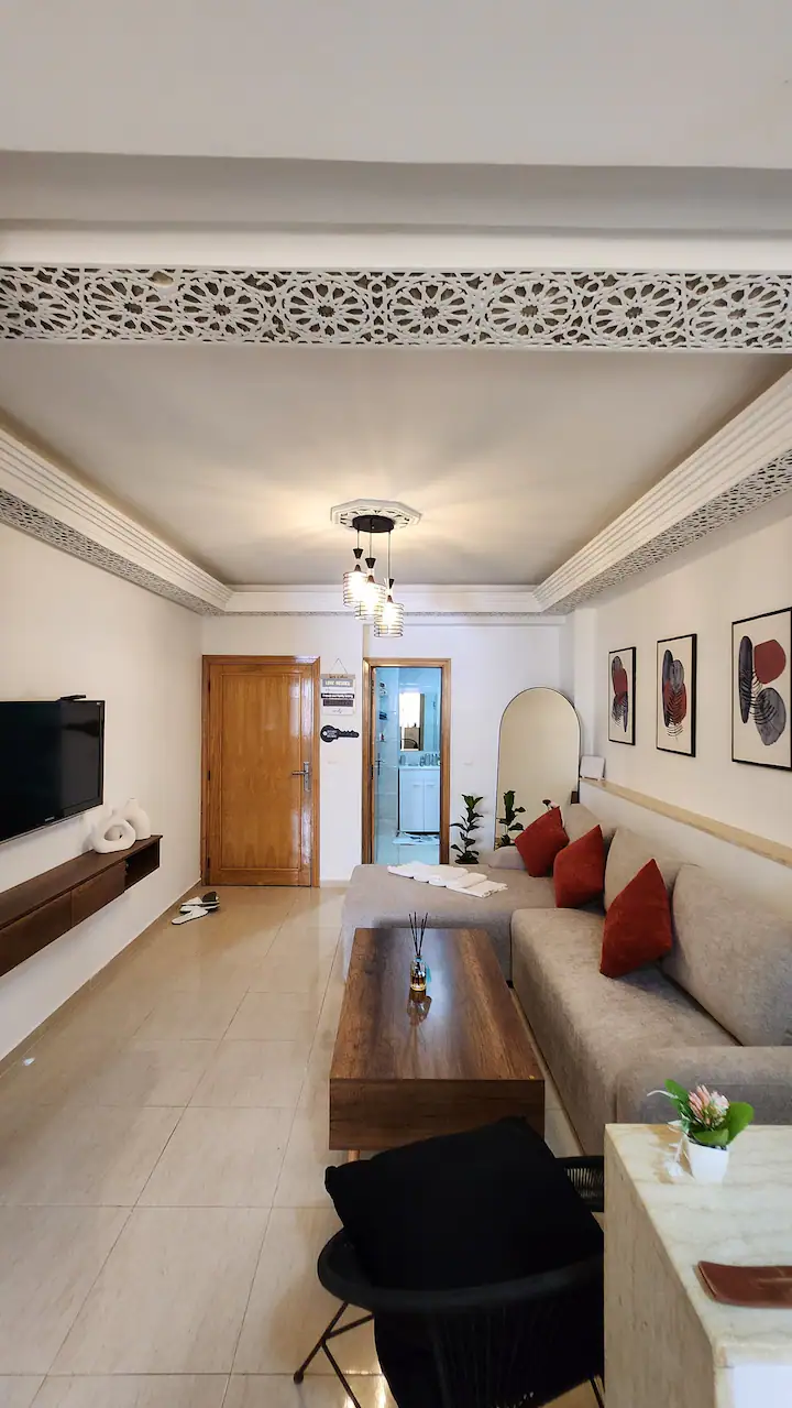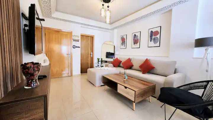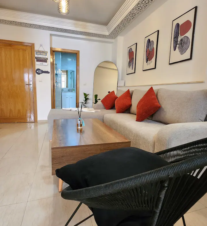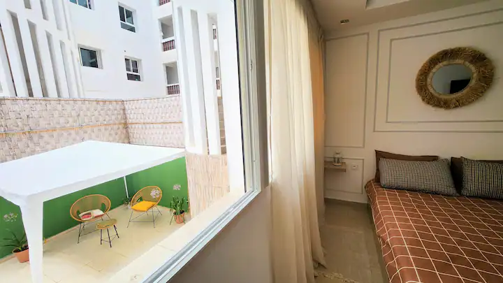 Welcome to our modern condo in the heart of Rabat, just minutes from the Atlantic shore and the historic medina. This stylish retreat features an open-plan living room, a kitchen with all essentials, and a spacious bedroom with ample storage. Step out onto the private patio to enjoy your morning coffee or unwind after a day of exploring. The apartment boasts contemporary furnishings, high-speed internet, and convenient access to cafes, restaurants, and public transportation.